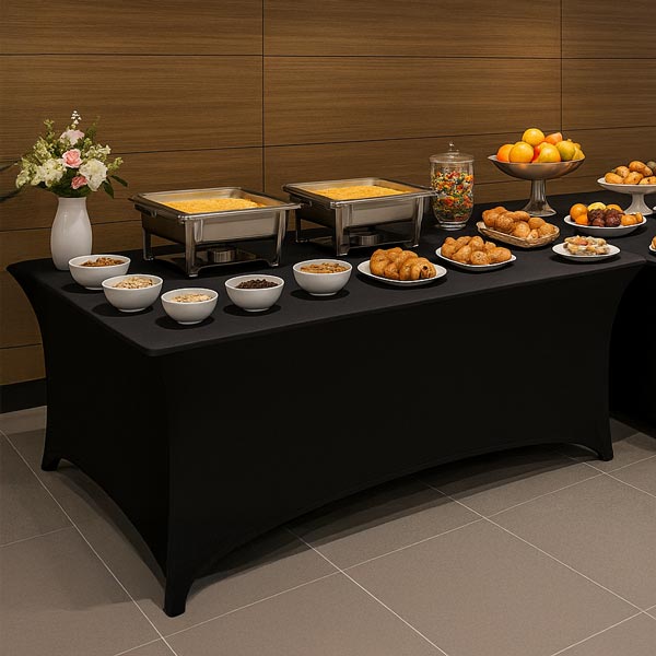 This three-sided stretch tablecloth offers the perfect blend of style and convenience. The open-back design allows for discreet storage and quick access during service — making it ideal for buffet stations, catering setups, or trade show displays where both elegance and efficiency matter.